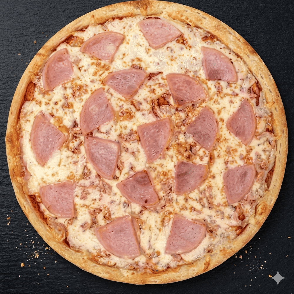 Тесто, фирменный соус, ветчина, сыр моцарелла